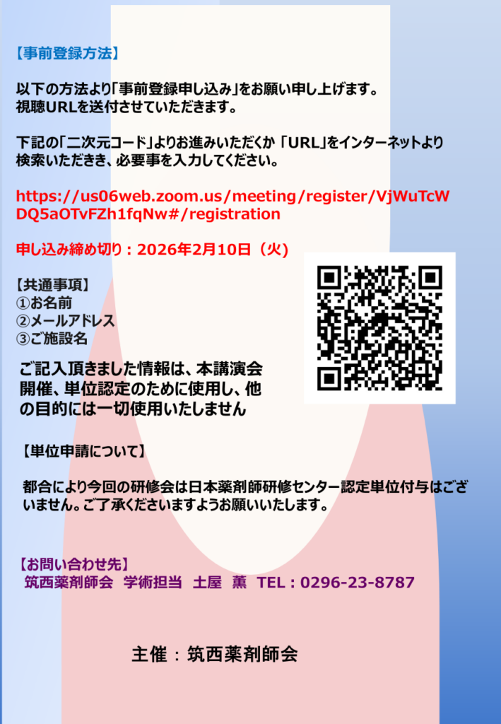 発生機序から考える副作用モニタリング 2026年2月12日(木)19:00~21:00 2026年1月24日 最終更新日時 : 2026年1月24日 editcksy3 今回は都合により日本薬剤師研修センター認定単位(1 単位)はございません。ご了承ください。 研修会情報の一覧へ